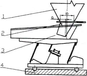 電磁振動給料機的振幅和給料量受料倉倉壓影響較大,設(shè)計料倉時應(yīng)盡量減少倉壓,使溜咀后側(cè)板承受一定的倉壓,并設(shè)置斜溜沮及下料閘門。如圖,一般a=1/4b。溜咀四周應(yīng)與給料槽留有一定的間隙,一般5~10mm,以免產(chǎn)生噪音及影響振動。